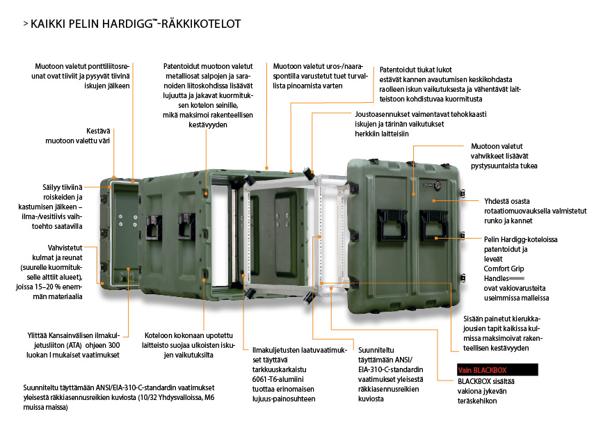 Innovatiivinen suunnitteluprosessi ja ankarat testimenetelmät tuottavat ylivoimaisia patentoituja innovaatioita, jotka suojaavat tärkeät, herkät ja kalliit elektroniikkalaitteet. Pelin Hardigg™-räkit kestävät toistuvia putoamisia, iskuja ja veteen uppoamisia suojaamalla samalla laitteet. Voit suojata elektroniikkalaitteet parhaiten ottamalla käyttöön Pelin Hardigg™-kotelot.