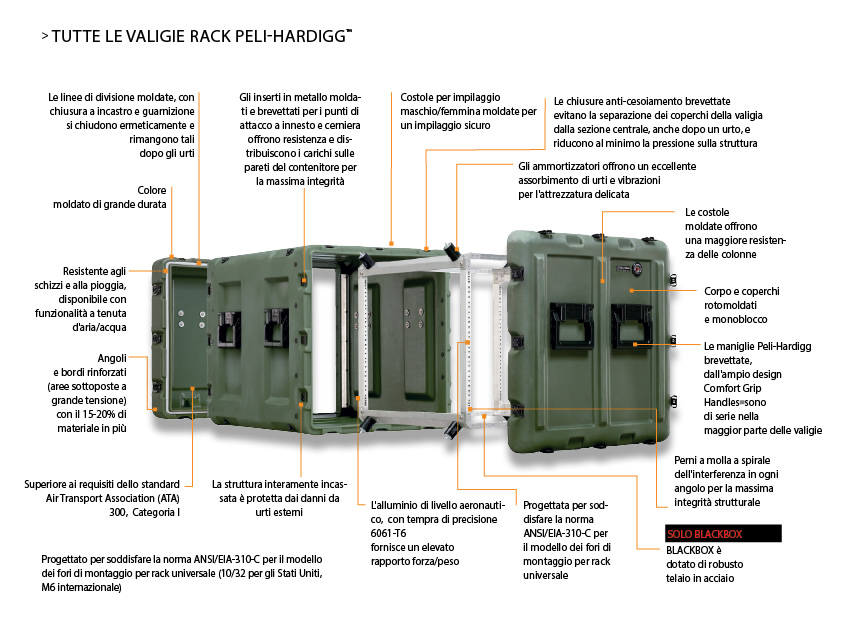 Il nostro processo di progettazione innovativo e i rigorosi metodi di test continuano a produrre innovazioni brevettate di qualità superiore che garantiscono una protezione costante per i vostri dispositivi elettronici fondamentali, sensibili e costosi. Le valigie per rack Peli-Hardigg™ possono sopportare cadute, colpi e immersioni ripetuti, proteggendo sempre il contenuto. Quando si tratta di elettronica, niente protegge meglio di una valigia Peli-Hardigg™.