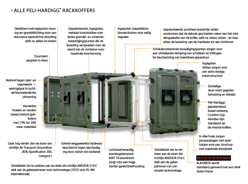 Onze innovatieve ontwikkelingsprocessen en strenge testmethoden blijven superieure, gepatenteerde vernieuwingen opleveren, die garanderen dat uw belangrijke, gevoelige en kostbare elektronica steeds optimaal beschermd zijn. De Peli-Hardigg™ Rackmount-koffers zijn bestand tegen herhaald vallen, stoten en onderdompelen en blijven uw kostbare uitrusting steeds beschermen. Wanneer het gaat om elektronica, zorgt niets voor een betere bescherming dan een Peli-Hardigg™-koffer.